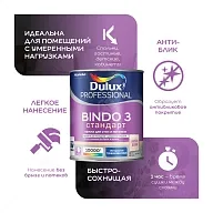 Dulux Bindo 3 Professional отличается тиксотропными свойствами, что позволяет наносить её без брызг и потёков, а также обеспечивает лёгкость разравнивания. Она имеет нейтральный запах и предназначена для использования в помещениях с умеренной влажностью и эксплуатационной нагрузкой. Подходит для нанесения на полностью просохшие и гладкие минеральные поверхности (бетон, штукатурка, кирпич), гипсокартон, обои под покраску, деревянные поверхности и ДВП. Сертифицирована для использования в детских и лечебно-профилактических учреждениях.