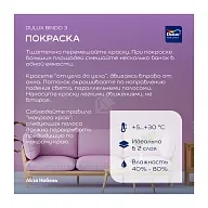 После месяца окрашенная поверхность устойчива к мытью с использованием мягких моющих средств, хотя возможно небольшое изменение блеска покрытия. Не оставляйте поверхность мокрой после очистки. Краска для стен и потолков Dulux Bindo 3 Professional идеально подходит для помещений с умеренной нагрузкой, образуя антибликовое покрытие и обеспечивая легкость нанесения без брызг и потеков.