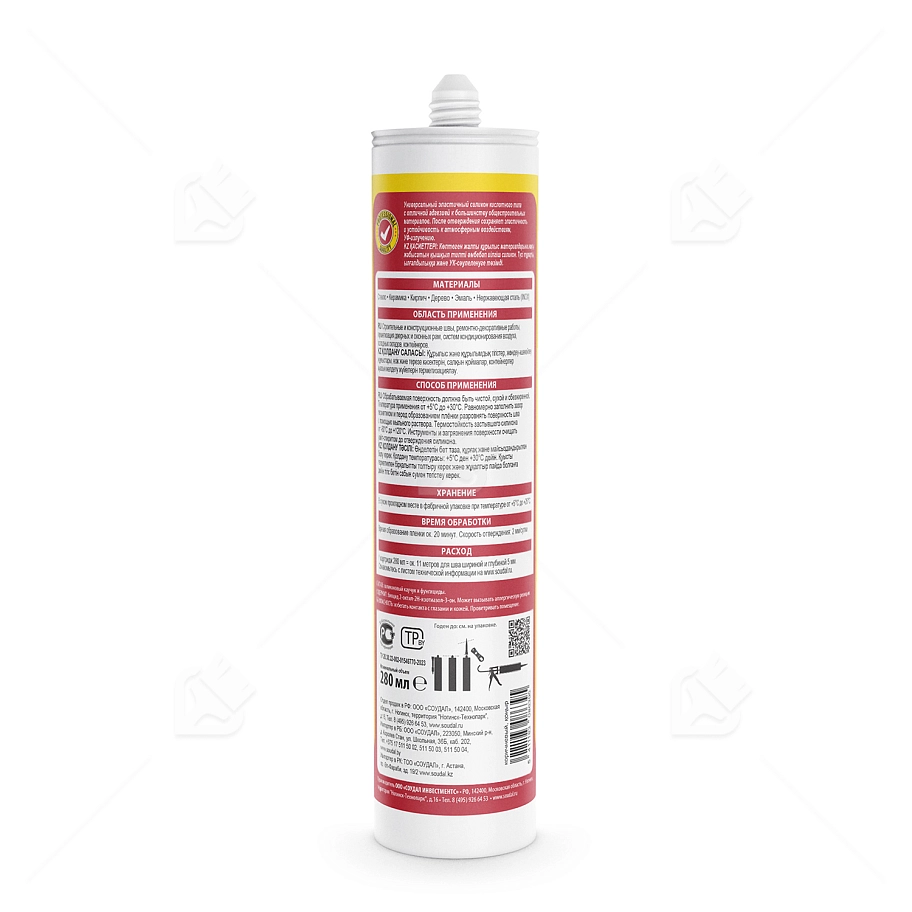 • Подготовка поверхности: пористые поверхности можно обработать грунтом Soudal Primer 150, непористые поверхности грунтовки не требуют;